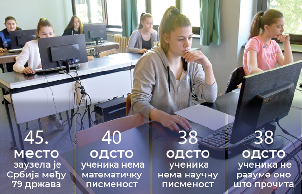 - Na skali čitalačke pismenosti 38 odsto naših učenika ne dostiže osnovni nivo, 40 odsto iz matematičke i 38 odsto iz naučne pismenosti - rekla je Marina Videnović, iz Instituta za psihologiju. - Naši đaci osvojili su 439 poena iz čitalačke, 448 iz matematičke i 440 iz naučne pismenosti, a prosek je 500 poena. Srbija za zemljama OECD zaostaje više od 40 poena, što znači da je našim učenicima potrebno još godinu i po školovanja da bi tu razliku sustigli.