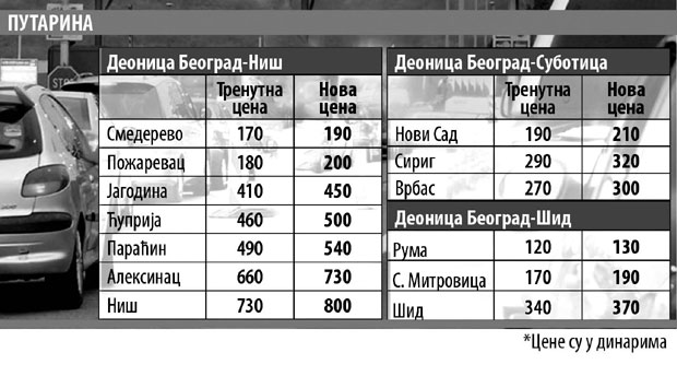 IZNOS putarine vozači će na auto-putevima u Srbiji uskoro plaćati 10 odsto više. Za vožnju od Beograda do Niša umesto 730 dinara, moraće da izdvoje oko 800 dinara. Putovanje od prestonice do hrvatske granice, koštaće 375 umesto 340 dinara, dok će putarina od Beograda do Novog Sada biti 210 dinara.