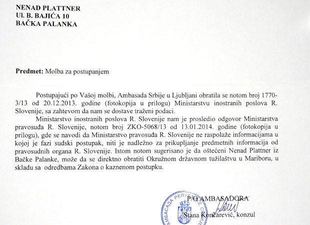 Platner se obratio nadležnim slovenačkim vlastima, ali i našoj ambasadi u Sloveniji, kako bi ga zaštitile. Ipak, istraga povodom ovog slučaja već godinama tapka u mestu.