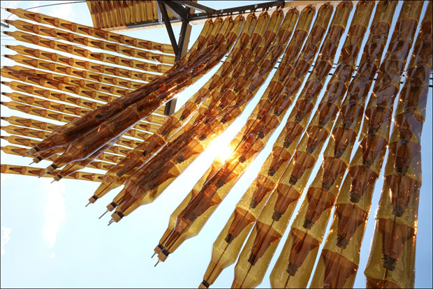Predstavljeni su suncobrani i klupe od reciklirane plastike (dvolitarskih flaša piva koje je tim studenata Fakulteta primenjenih umetnosti osmislio u rekordno kratkom roku.