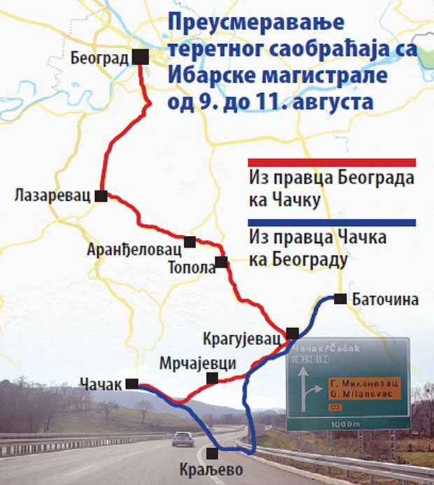 Za teretna vozila iznad 7,5 tona važiće izmenjen režim, pa će saobraćaj iz pravca Beograda ka Čačku biti preusmeren iz Lazarevca, okolnim putem preko Aranđelovca, Topole i Mrčajevaca do Preljine.