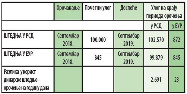 Analiza NBS pokazuje da bi štediša koji je u poslednjih godinu dana štedeo u dinarima na ulog od 100.000 dinara dobio oko 2.700 dinara, ili oko 23 evra više u odnosu na deviznog štedišu koji je u istom periodu oročio 845 evra - što je protivvrednost 100.000 dinara.