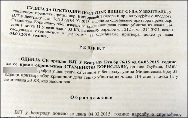 Borislav je na saslušanju negirao bilo kakvu umešanost u zločin. Uostalom, kako je to kasnije procenio i sud, nije ni bilo elemenata za njegovo dalje zadržavanje. Naime, u odluci suda da mu se omogući odbrana sa slobode, kao obrazloženje navodi se i podatak da na nađenoj satari nema njegovih otisaka, niti tragova krvi žrtava na Borislavljevoj odeći.