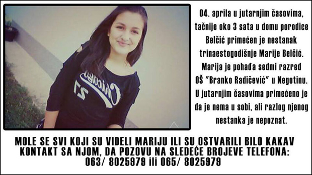 NEGOTIN – Marija Belčić (13) iz Negotina, učenica Osnovne škole „Branko Radičević“ nestala je u noći između nedelje i ponedeljka. Deda, kod koga je živela jer se školovala u Negotinu, poslednji put je čuo oko dva sata, kada je iz svoje sobe prošla kroz sestrinu i otišla u kupatilo. Nakon toga se devojčici gubi svaki trag.