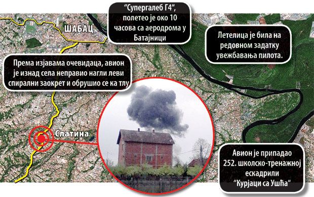 AVION Vojske Srbije "supergaleb G4" sa dvojicom članova posade srušio se u petak ujutru u selu Slatina kod Šapca. U teškoj vazduhoplovnoj nesreći poginuli su piloti potpukovnik Nenad Ćulibrk (49) i kapetan Dejan Pandurović (38). Ministar odbrane Zoran Đorđević dao je nalog da se sprovede vanredna inspekcija, a načelnik Generalštaba VS Ljubiša Diković i komandant Ratnog vazduhoplovstva Ranko Živak formirali su komisije za utvrđivanje okolnosti pada aviona.