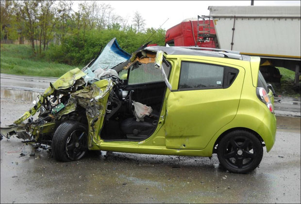 Iz ove poslednje slike se vidi šta je moderan auto i koliko je bitno da imate auto sa dobrim ocenama na kreš testu. Bez obzira što je mali, dizajnom su uspeli da apsorbuju sile udara i sačuvaju kabinu čitavu i tako spase život vozača, a pogledajte kakav šleper ga je udario!