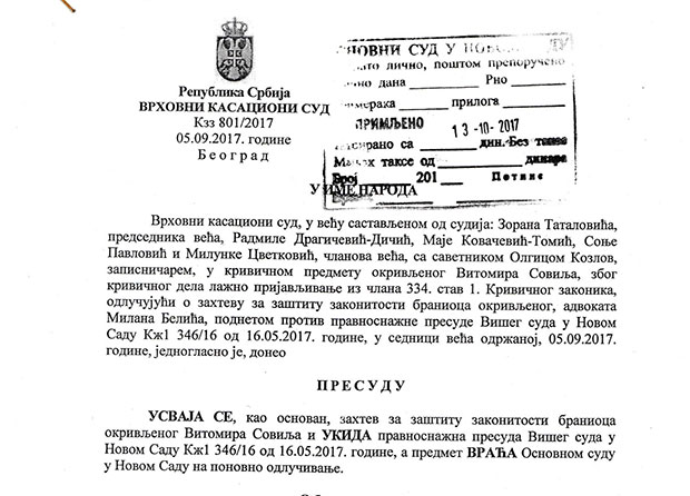 Tako je 5. septembra prošle godine usledila odluka najviše sudske instance u zemlji, Vrhovnog kasacionog suda kojom je ukinuta presuda Višeg suda u Novom Sadu iz maja 2017. i predmet Vitomira Sovilja vraćen novosadskom Osnovnom sudu na ponovno odlučivanje.