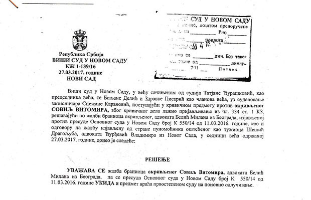 Nezadovoljan sudskom odlukom, branilac okrivljenog uložio je žalbu Višem sudu u Novom Sadu. Veće tog suda sačinjavali su sudija Tatjana Đurašković, predsedavajuća, dok su Biljana Delić i Zdravka Pisarić bile članovi veća. One su na sednici održanoj 27. marta ove godine, donele rešenje po kojem uvažavaju žalbu advokata Belića, ukidaju prvostepenu presudu Sovilju i predmet vraćaju na ponovno odlučivanje, odnosno suđenje u Osnovnom sudu u Novom Sadu.