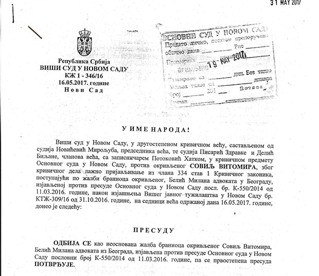 - Posle mesec dana od ukinute presude, dok smo čekali da se zakaže i započne glavni pretres mom klijentu, Viši sud donosi, za isti predmet, a bez ponovljenog suđenja, potpuno drugačiju odluku - kaže Belić. - Oni 16. maja 2017. odbijaju našu žalbu i potvrđuju prvostepenu presudu Osnovnog suda u Novom Sadu i to isti članovi veća, sudija Delić i sudija Pisarić. Izmenjen je samo predsedavajući i postavljen je sudija Miroljub Novićević.