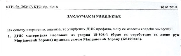 Ovo je zaključak veštačenja brisa sa ruke Zorana Marjanovića, osumnjičenog za ubistvo supruge, koji je pre nekoliko dana stigao u Više javno tužilaštvo u Beogradu. Bris rane na ruci uzet je odmah posle pronalaženja Jeleninog tela 2. aprila 2016. godine u kanalu na nasipu Crvenka u Borči. Prethodno je Apelacioni sud u Beogradu, koji je doneo rešenje o vraćanju optužnice, zatražio ovo veštačenje.