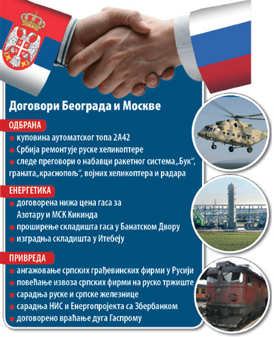 NIŽA cena ruskog gasa za "Azotaru" i MSK Kikinda, kupovina naoružanja, veliki posao remonta ruskih helikoptera, ulaganje u infrastrukturu naše zemlje, otvaranje tržišta za srpske firme i dodatno jačanje političkih veza Beograda i Moskve - glavni su rezultati trodnevne posete premijera Aleksandra Vučića, ministara i privrednika Ruskoj Federaciji.