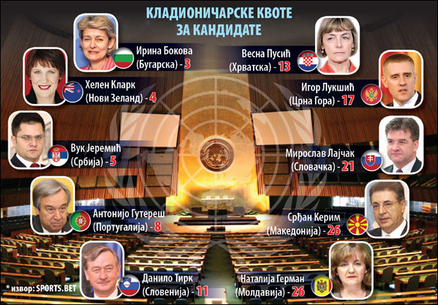 PETNAEST članica Saveta bezbednosti danas po podne je na tajnom izjašnjavanju ocenilo 12 kandidata za novog generalnog sekretara Ujedinjenih nacija, a Vuk Jeremić je u krugu favorita. Kako "Novosti" saznaju iz diplomatskih izvora on je dobio devet pozitivnih ocena uoči sledećeg kruga.