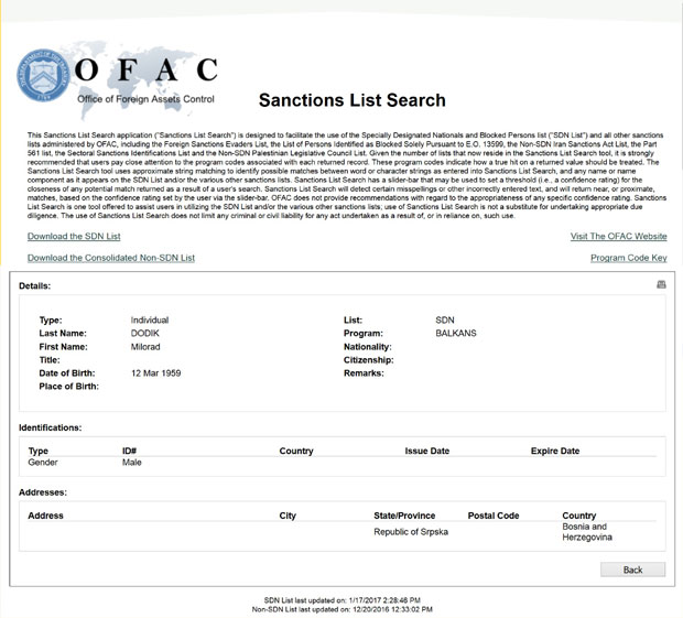 Da su Dodiku uvedene sankcije SAD potvrdjeno je i na sajtovima Kancelarija za kontrolu stranih sredstava (OFAC) i Ministarstva finansija.