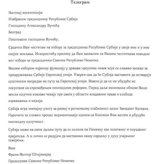"Srdačno Vam čestitam na izboru za predsednika Republike Srbije. Vašim izborom najvišu funkciju u državi preuzima čovek koji se snažno zalaže za pridruživanje Srbije Evropskoj uniji", naveo je Štajnmajer u čestitki.