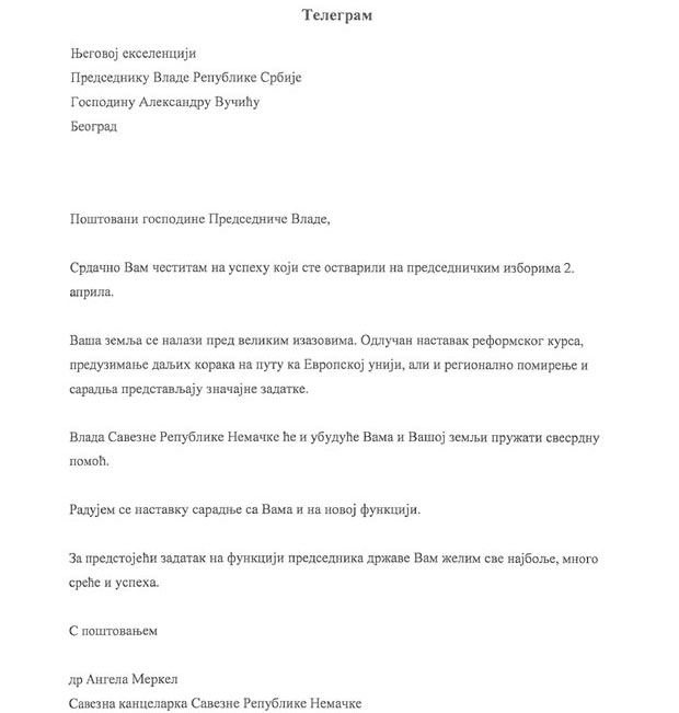 veliki rad i trud koji Srbija ulaže priznaje cela Evropa zato je Vučić dobija čestitke I od kancelarke Angele Merkel i predsednika Frank-Valtera Štajnmajera povodom pobede na predsedničkim izborima