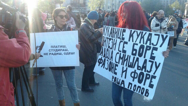 Učesnici su nosili parole protiv ministra prosvete Mladena Šarčevića, a posebnu pažnju demonstranata i prolaznika privukao je transparent iznad glave jednog mladića - "ovde sam samo zbog para".