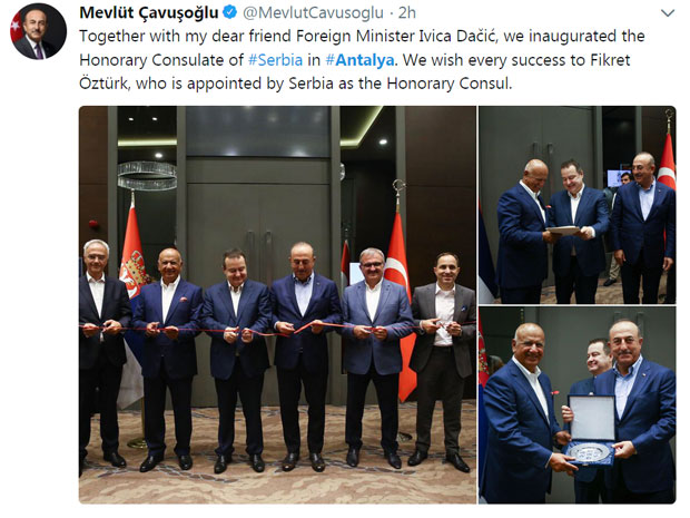 Dačić je sa ministrom spoljnih poslova Turske Melvutom Čavušogluom danas u Antaliji na jugu Turske prisustvovao ceremoniji otvaranja konzulata Srbije, čije će područje biti provincija Antalija. Na čelu Konzulata Srbije u Antaliji biće počasni konzul Fikret Ozturk.