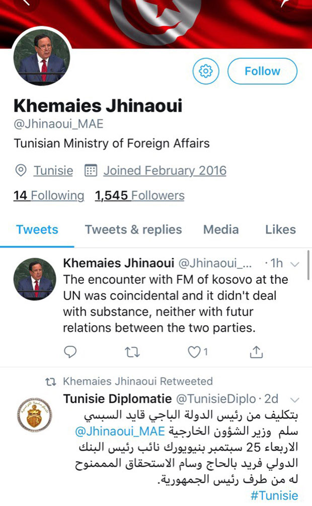 - Susret sa ministrom spoljnih poslova Kosova bio je slučajan i nije se bavio suštinskim pitanjima, kao ni budućim odnosima dve strane – napisao je tuniski šef diplomatije na Tviteru.