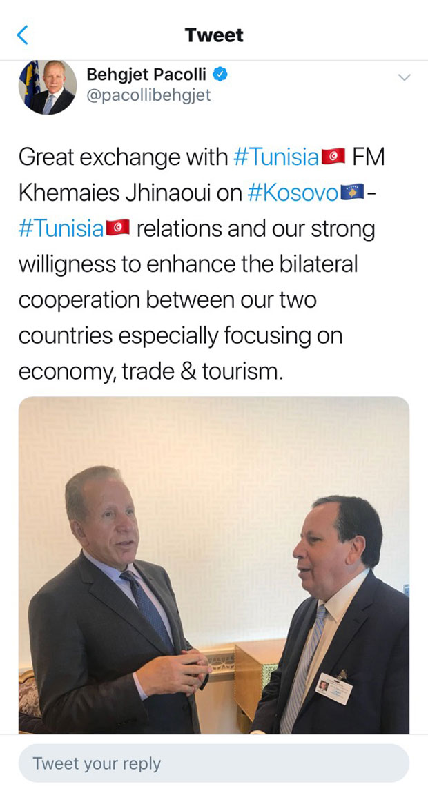 “Susret sa ministrom spoljnih poslova Kosova bio je slučajan i nije se bavio suštinskim pitanjima, kao ni budućim odnosima dve strane” napisao je tuniski šef diplomatije