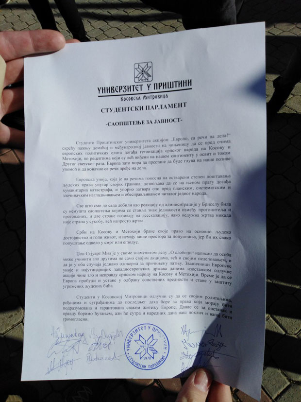 Studenti - budite vesnici promena i kretanja na bolje i izvadite nas iz politickog blata!Sami iskoristite Ahtisarijev plan i Briselski sporazum, napravite ZSO, otvorite svoje institucije i pocnite sa normalnim zivotom, a stavite i Albance i politicke vodje Srba pred svrsen cin!PS - svaki student ima vise znanja od 99.9% Titovih partizana nakon 2. Sv. rata, a ti partizani napravise drzavu...