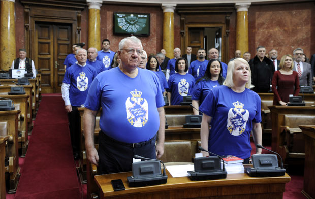 POSLANICI radikala došli su u utorak na sednicu isto obučeni. Nosili su majice kratkih rukava plave boje. Na njima je pisalo "Kosovo je zauvek Srbija". Parlamentarac Miladin Ševarlić ušao je u salu odeven u srpsku narodnu nošnju.