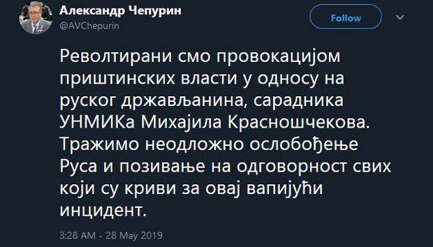 "Revoltirani smo provokacijom prištinskih vlasti u odnosu na ruskog državljanina, saradnika UNMIKa Mihajila Krasnoščekova. Tražimo neodložno oslobođenje Rusa i pozivanje na odgovornost svih koji su krivi za ovaj vapijući incident", napisao je Čepurin na "Tviter".