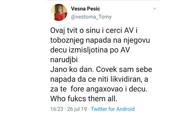 -Ovaj tvit o sinu i cerci AV i tobožnjeg napada na njegovu decu je izmišljotina po AV narudžbi. Jasno ko dan. Čovek sam sebe napada da će biti likvidiran, a za te fore angažovao i decu. Who fukcs them all - napisala je Đilasova promoterka Vesna Pešić na svom Tviter nalogu.