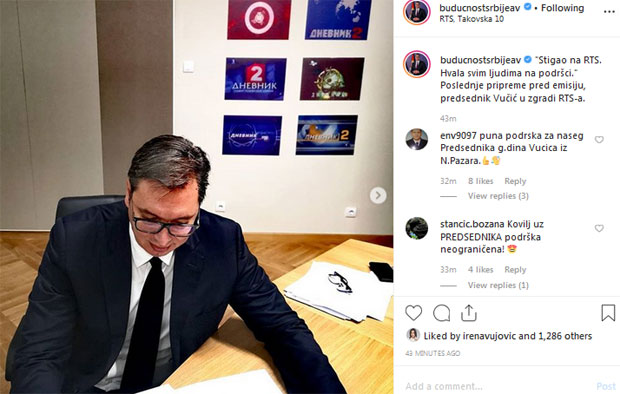 - Stigao na RTS. Hvala svim ljudima na podršci. Poslednje pripreme pred emisiju", napisao je Vučić na profilu "budućnostsrbijeav", uz fotografiju, za stolom, sa papirima i dokumentima.