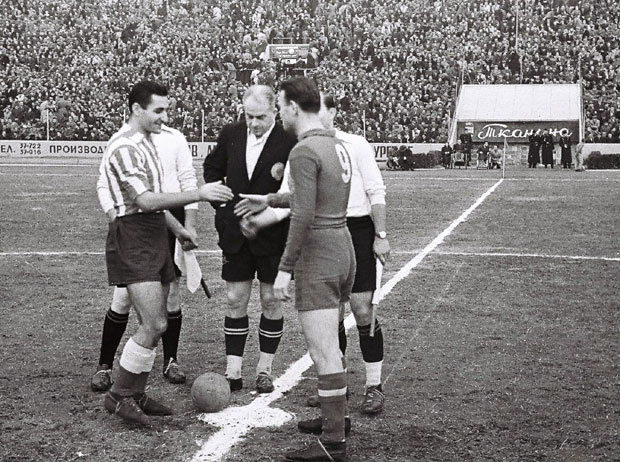 Kapiteni Rajko Mitić i Stjepan Bobek, sa sudijom Vasom Stefanovićem, pred 4. derbi 1953.