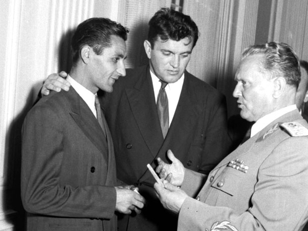 Vladimir Dedijer (u sredini) sa Zvezdinim kapitenom Rajkom Mitićem i Josipom Brozom