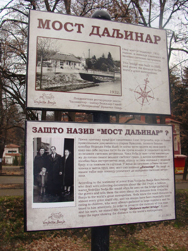 Ovi precizni podaci ispisani su na tematskom mostu, simbolično nazvanim "Daljinar", u centru Vrnjačke Banje, u Aleji lipa ispred poznatog restorana "Srbija" koje je svojevremeno, krajem 19. veka, zasadio vojvoda Lune, legendarni predsednik vrnjačke opštine.
