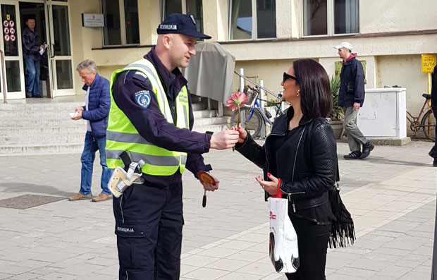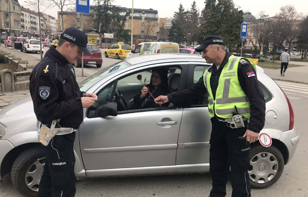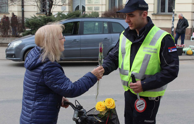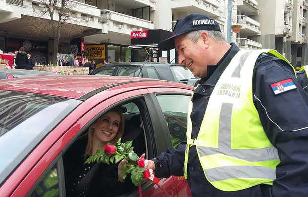UMESTO kazni za prekršaje, policajci širom Srbije u petak su damama uručivali - cveće. Ovaj mali znak pažnje pripadnici MUP u mnogim gradovima poklanjali su damama povodom 8. marta, Dana žena, prilikom redovne kontrole saobraćaja, želeći da im iskažu iskreno poštovanje, uz poruku da i dalje budu savesne i odgovorne učesnice u saobraćaju. Sličnim gestom, pripadnicama lepšeg pola praznik su čestitali i radnici Javnog prevoza u Novom Sadu. Na poklon su u autobusima JGSP dobijale slatkiše i cveće.