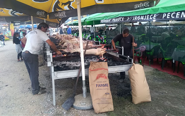 NA ulasku u deo vašarišta rezervisan za ugostitelje, čuje se srpsko kolo. Dok veselo trlja ruke, vlasnik šatre pokazuje nam čoveka koji seče vruće pečenje i po izrazu lica reklo bi se da nešto negoduje: "Ovo napred je prase, a ono iza je Rade. Slikajte ga da se uteši. Opekao je prste".