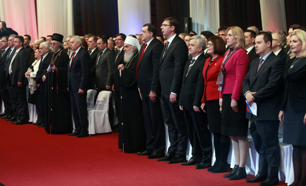 Svečana akademija, kojoj je prisustvovao gotovo ceo politički vrh Srbije i Republike Srpske, kao i patrijarh srpski Irinej, počela je intoniranjem himni Srbije i Srpske, a svečanu besedu kazivao je pesnik i akademik Matija Bećković.
