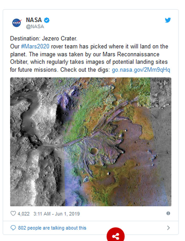 Fotografija kratera na Marsu koji je dobio ime po opštini Jezero može se videti na Tviter nalogu agencije NASA.