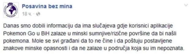 Humanitarna organizacija "Posavina bez mina" iz Brčkog, dobila je informaciju da pojedini korisnici aplikacije "Pokemon Go" u BiH zalaze u rizične površine, da bi našli pokemona.