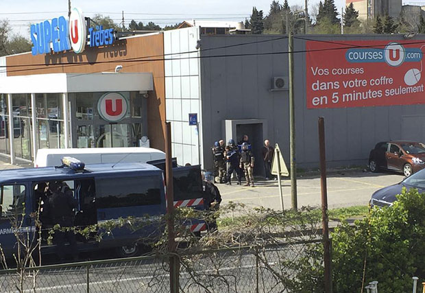 Svoju ubilačku akciju završio je u tržnom centru u mestu Treb, desetak kilometara od Karkasona, gde je, oko 11 sati, kao taoce uzeo dvadesetak ljudi koji su se tu zatekli. Čim je uleteo u supermarket, uzviknuo je "Alahu akbar!" i rekao da je vojnik Islamske države, uz poruku: "Bombardujete Siriju, sada ćete da umrete". Ubio je dvoje ljudi, šefa na odeljenju mesnih proizvoda i jednu stariju osobu, čija su tela nepomično stajala na podu i bila vidljiva spolja, dok je trajala policijska opsada.