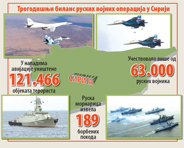 Tako se navodi da je u napadima ruske vojske u Siriji uništeno više od 86.000 terorista i 830 vođa bandi. Ruska mornarica je tokom operacija na teritoriji Sirije izvela 189 borbenih pohoda, u kojima je učestvovalo 86 brodova i 14 podmornica.