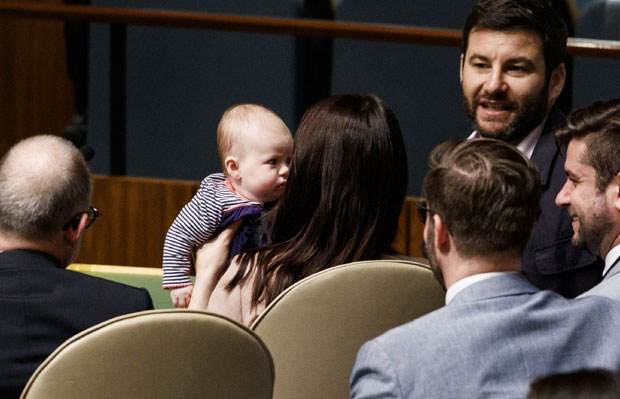 Novozelandska premijerka Džasinda Ardern je debitovala na Generalnoj skupštini UN, kao prvi lider koji je poveo svoju bebu na najveće okupljanje svetskih lidera. Dok Ardern radi, tromesečnu kćerku Neve Te Aroha čuva njen partner Klark Gejford. Ona kaže da doji bebu pa je zato donela "veoma praktičnu odluku" da je povede u Njujork, gde je devojčica opisana kao "prva beba" na identifikacionoj kartici UN.