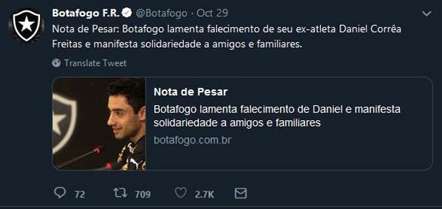 "Botafogo žali zbog smrti Danijela Koree Frejtasa i izražava saučešće prijateljima i porodici", stoji u objavi na "Tviter" nalogu Botafoga.