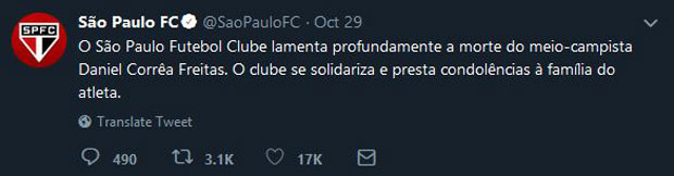 "Fudbalski klub Sao Paolo duboko žali zbog smrti igrača sredine terena Danijela Koree Frejtasa", stoji u objavi.