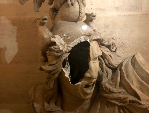 Kružne stepenice vode na vrh pedeset metara visokog spomenika. Tragovi rušenja još su vidljivi. Iza drvenog paravana i pleksiglasa, kojim kao da je privremeno uramljen epilog urbane gerile, zlokobno zjapi razvaljeno lice Genije slobode, detalj sa velike kompozicije "Odlazak dobrovoljaca" Fransoa Rida. Ova rupa u licu postala je jedan od negativnih simbola nacije. Moderni revolucionari popeli su se tu 1. decembra i za sobom ostavili pravu pustoš.