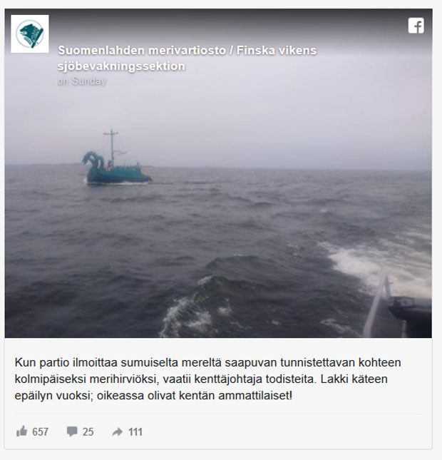Incident se desio 9. juna u Finskom zalivu, kada su graničari dobili signal o nepoznatom brodu. Patrolni brod je bio poslat da izvrši proveru jahte. Graničari su u magli otkrili čudan objekat koji je finska oblaska straža na svom fejsbuku okazakterisala kao „troglavo čudovište“.