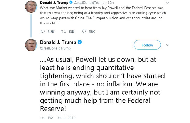 "Ono što je tržište želelo da čuje od Džeja Pauela i Federalnih rezervi jeste da je ovo početak dugotrajnog i agresivnog ciklusa snižavanja kamate, koji će ići u korak sa Kinom, Evropskom unijom i drugim zemljama širom sveta. Kao i obično, Pauel nas je izneverio", napisao je Tramp na Tviteru.