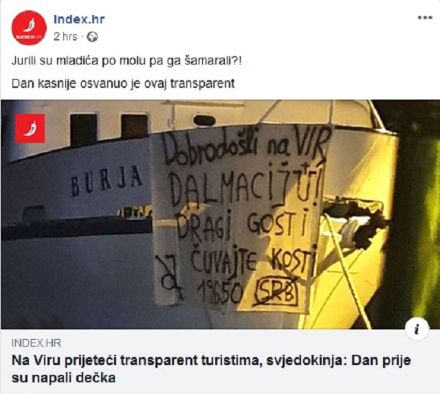 Na ostrvu Vir u Hrvatskoj sinoć je postavljen preteći transparent turistima. "Dobro došli na Vir, Dalmaciju! Dragi gosti, čuvajte kosti", stoji na transparentu obešenom na brod uz precrtan znak Dinama, precrtan natpis "SRB" i uz ustaško "U".
