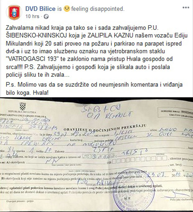 "Zahvalnosti nikad kraja, pa se tako i sada zahvaljujemo PU Šibensko-kninskoj koja je zalepila kaznu našem vozaču Ediju Mikulandri koji je 20 sati proveo na požaru i parkirao na parapet (zidna ograda) ispred DVD-a i uz to imao službenu oznaku na vetrobranskom staklu "VATROGASCI 193" te zaklonio nama pristup. Hvala gospodo od srca!!!!", napisali su vatrogasci.