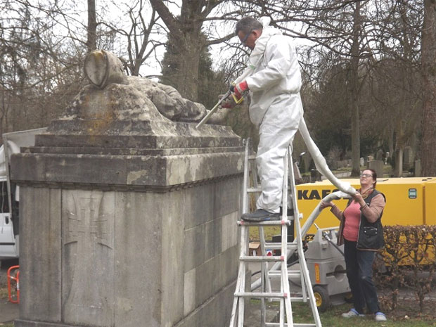 Ne samo kod nas, nego i kod Nemaca jer se o spomeniku na Internetu teško može naći neki opširniji podatak. Danas je spomenik dosta zapušten, izgleda ružno i potrebna je veća stručna restauracija. Preduzeće porodice Lukić iz Štutgarta je već dva puta svojim specijalnim mašinama na molbu Konzulata besplatno čistilo zaprljanost spomenika. Otklonjena je narasla mahovina ali sve to nije dovoljno da se on spasi od daljeg propadanja. Sa kamena –peščara morale bi da se restauracijom otklone bezbrojne ružne svetle mrlje i vrati svetla boja kamenu.