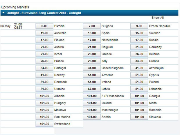 Od zemalja bivše SFRJ, najbolje se kotira hrvatska predstavnica Franka, sa kvotom 34. Trenutno, najveće šanse za pobedu kladionice daju Estoniji (kvota šest) i Bugarskoj (kvota sedam).