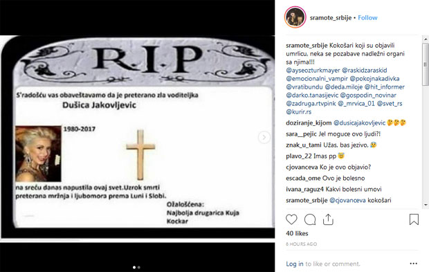 BIZARNO: Hejteri Dušice Jakovljević objavili njenu umrlicu
