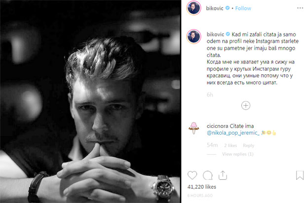 - Kad mi zafali citata ja samo odem na profil neke Instagram starlete, one su pametne jer imaju baš mnogo citata - napisao je Biković koji je dobio mnogopozitivnih komentara na račun svoje "dosetke".